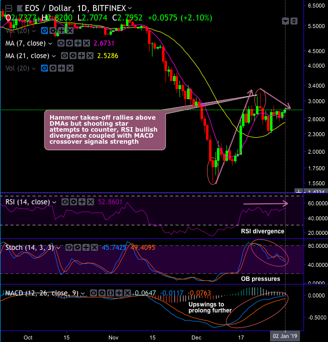 Technically, the pair has occurred at the hammer at 1.7589 levels that takes-off rallies above DMAs but shooting star attempts to counter, RSI bullish divergence coupled with MACD crossover signals strength. Since on December 28, the price of EOS was range bound between the levels of $2.6 and $2.8. On a broader perspective, the bears have managed to breach below double top neckline at 3.9687 level, the attempts of upswings are restrained below 7&9-EMAs.