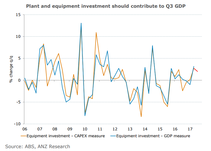 Capex is viewed as a precursor to GDP data (due for release on 6th December) and plant and equipment spending which shows direct contribution into GDP is expected to record solid growth in line with strong capital imports in the quarter. Analysts at ANZ Research expect spending on plant and equipment to rise by 2.0% q/q. Further, we anticipate a solid upward revision to firms' spending plans for 2017-18, given strength in business conditions.