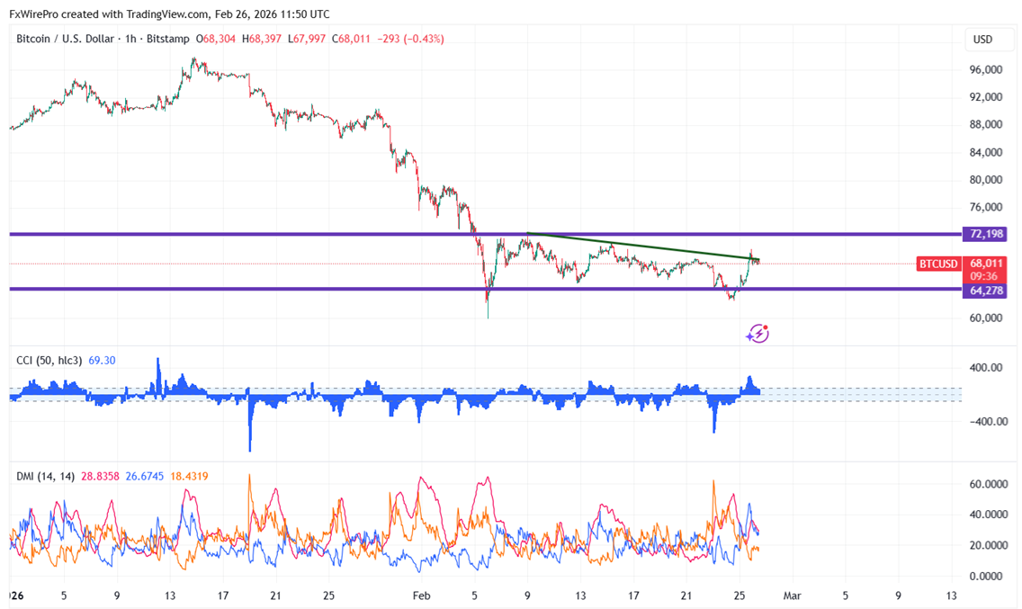 BTCUSD trades flat going into US-Iran negotiations. Yesterday it reached $70,038, but it is presently trading at $68,180.