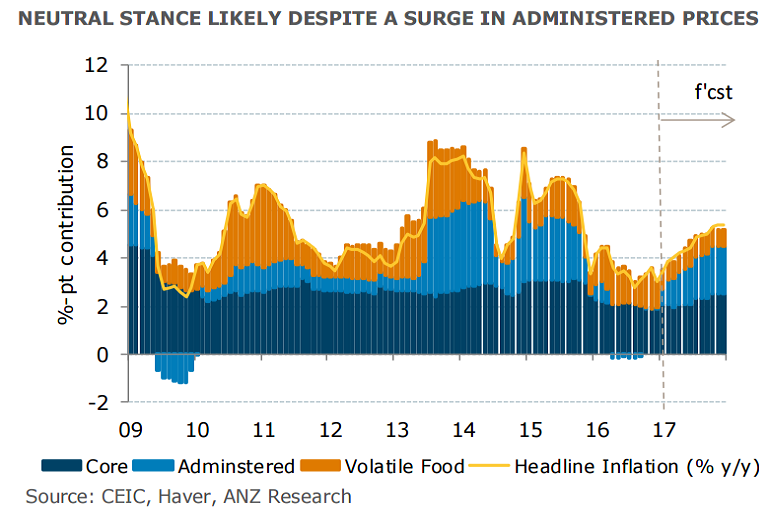 "We estimate that headline inflation is likely to periodically test the upper bound of Bank Indonesia’s (BI) inflation target in H2 2017. The official forecast corridor of 4% +/- 1% is, however, likely to be respected for the year as a whole," said ANZ in a report.