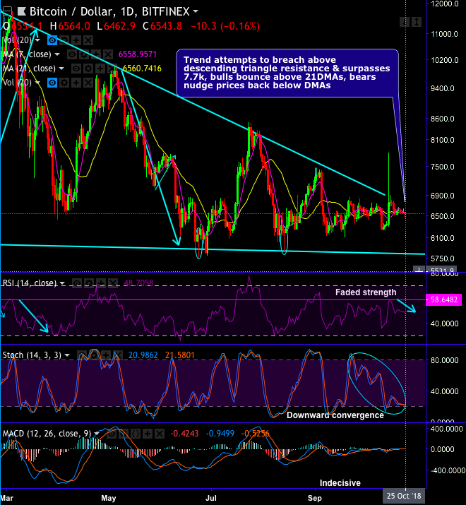 On the other hand, we notice the low volumes were observed in Bitcoin trades that has been a cause of concern for the cryptocurrency avenue from the last couple of days. Although BTC was expected to break out of major resistance levels at $6,800 and $7,000, low volumes prevented it from recording a major movement on the upside.