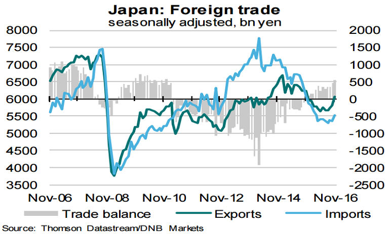 JPY weakened significantly against the dollar after Trump's surprise victory at 2016 U.S. Presidential election in November. A weaker yen makes Japanese exporters more competitive and makes the country a more attractive destination for tourists, which bodes well for the economy in 2017.