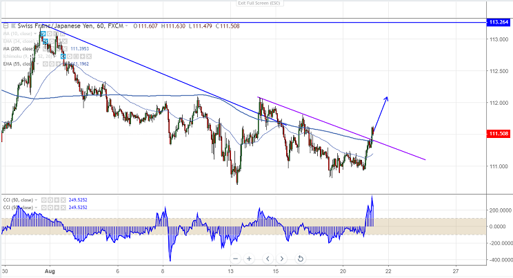 CHFJPY has formed a minor bottom around 110.80 and shown a more than 50 pips jump. It hits high of 111.43 and is currently trading around 111.41.