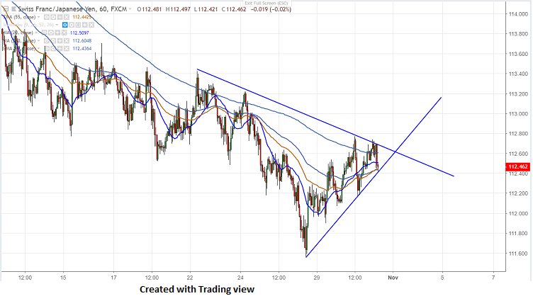 CHFJPY is consolidating after hitting high of 112.76. The pair has shown a minor dip till 112.22 and is trading around 112.59.