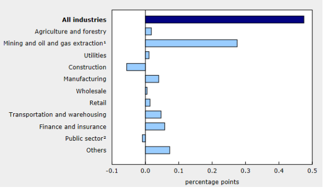 The goods-producing side of the economy rose 1.0 percent on the month, led primarily by gains in mining, quarrying, and oil and gas extraction. The services sector increased 0.3 percent month-over-month in July, with most sectors posting an increase. Overall, the report shows modest growth in July, with growth excluding mining, oil and gas, coming in at a more modest +0.2 percent month-over-month.