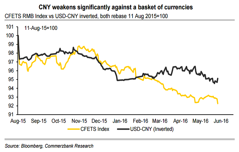 "We believe that China still wants to see a “managed depreciation” in the CNY exchange rate. We thus maintain our forecast that USD-CNY will reach 6.65 by the end of this year." said Commerzbank in a report.