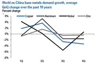As you can see from the exhibits, the one exception is nickel, which generally exhibits the strongest quarterly demand growth in 1Qs and the weakest in 3Qs due to the operational seasonality of stainless steel mills.