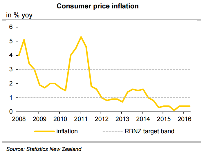 Inflation in New Zealand also remains low despite decent growth. Inflation has been below the RBNZ’s 1-3 percent target range since late 2014. RBNZ efforts to prop up inflation with rate cuts have been countered by strong exchange rate which keeps tradable goods inflation in negative territory. NZD trades above the levels anticipated by the RBNZ on a trade-weighted basis.