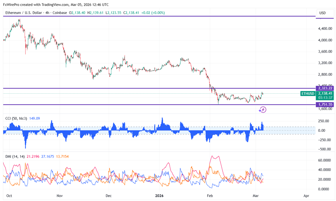 ETHUSD holds above $2100 as demand for riskier assets increases. The pair trades near $2127 after reaching a high of $2200.