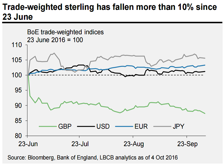 UK Prime Minister Theresa May's announcement to invoke article 50 by March 2017 at the latest, thus starting official exit negotiations has put considerable pressure on the Sterling. Markets are seeing an increased probability of what is widely reported in the media as ‘hard Brexit’. The pound sterling continues to decline, has not recovered after the June referendum vote despite incoming data showing strong resilience.