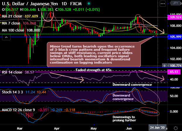 Consequently, the minor trend turns bearish upon the occurrence of this bearish pattern, and frequent failure swings at the stiff resistance zone of 109.400-109.800 levels, the current price slides below DMAs.