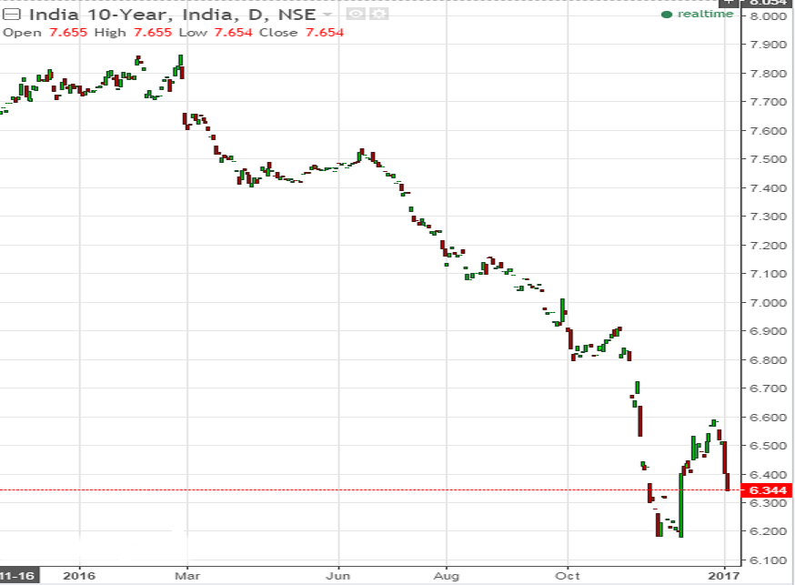 The Indian 10-year sovereign bond yields are expected fell to 6 percent in 2017 on rising speculation that the Reserve Bank of India (RBI) will lower its repo rate by 25 basis points to 6 percent in its next month monetary policy meeting. Also, negative demonetisation effect on domestic consumption, which contributes 60 percent to the GDP will boost safe-haven buying in 2017.