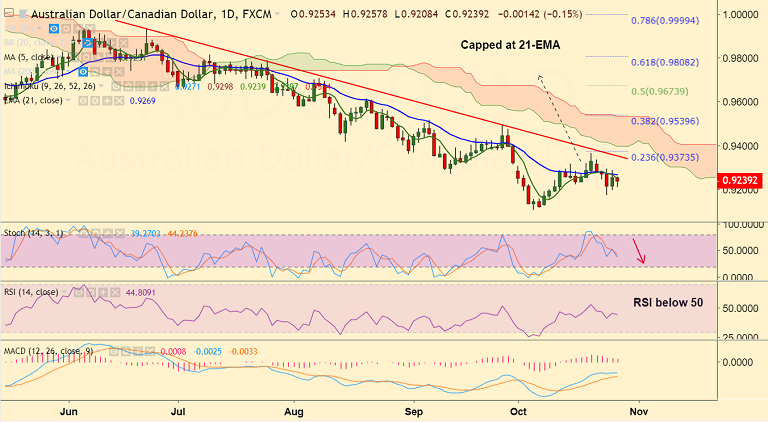 - On the flipside, we see weakness till 0.9105 (Oct 4th lows), further weakness on break below.