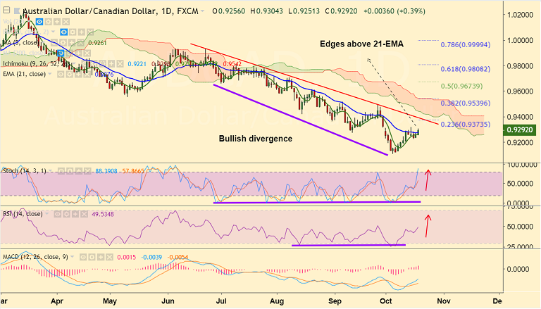 Support levels - 0.9276 (21-EMA), 0.9260 (5-DMA), 0.9223 (Oct 16 low), 0.9105 (Oct 4 low)