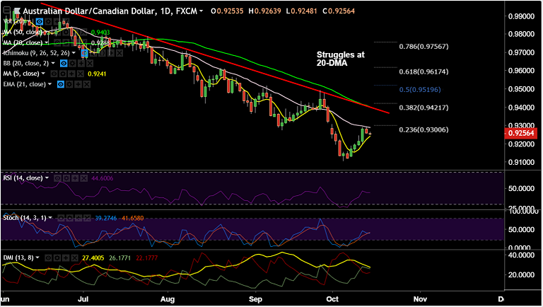 - The pair finds stiff resistance at 20-DMA and a decisive break above is required for further upside.