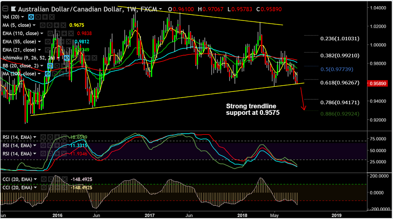 - Technical indicators are bearish. AUD/CAD has shown a breach at major trendline support at 0.9575.