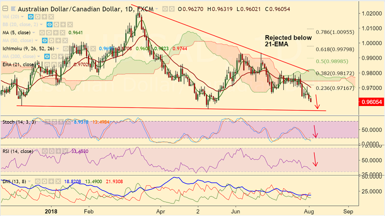- AUD/CAD is trading in a sloping Wedge pattern and finds stiff resistance at 21-EMA.