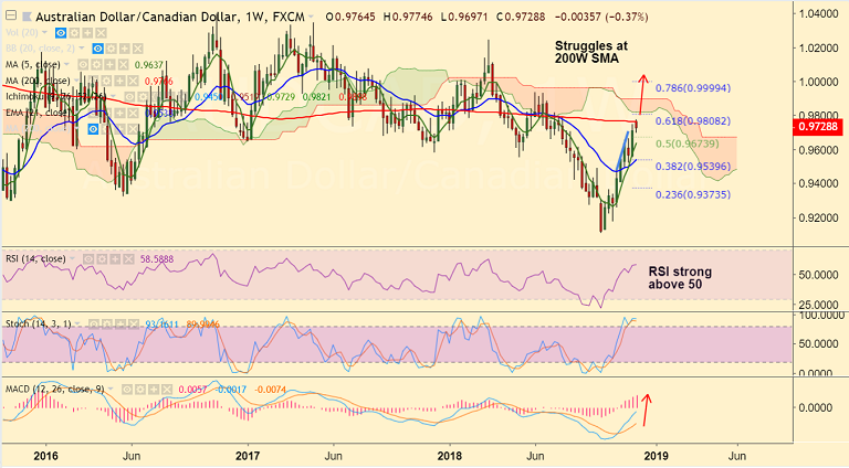 - AUD/CAD has failed to break above 200-W SMA which offers stiff resistance at 0.9766.