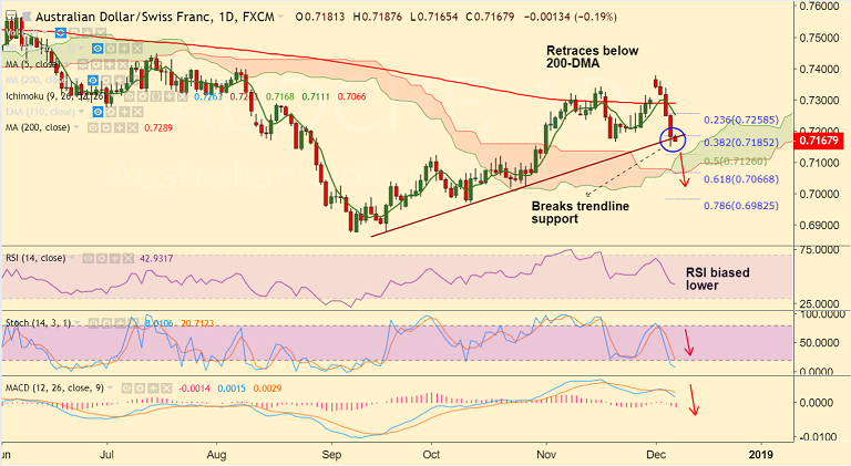 - Extends weakness for 5th straight session, breaks below major trendline support at 0.7175