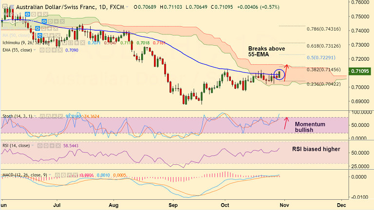 - AUD/CHF has broken above major resistance at 55-EMA, we see further upside.