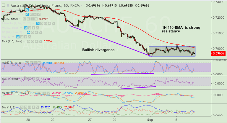 - AUD/CHF is extending sideways grind, hovers around 5-DMA at 0.6980.