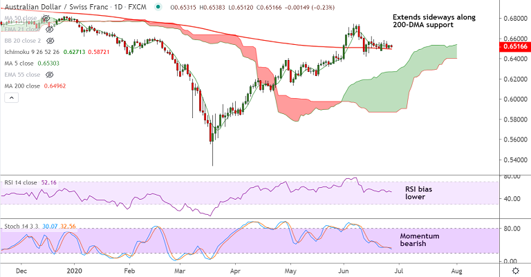AUD/CHF is extending range trade along 200-DMA support.