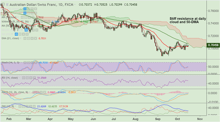 - AUD/CHF rejected at session highs at 0.7071, extends weakness below 50-DMA.