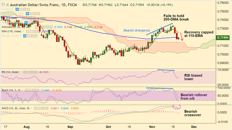 - Next major support below 110-EMA lies at 21-EMA at 0.7212 ahead of 0.7136 (converged trendline and cloud top)