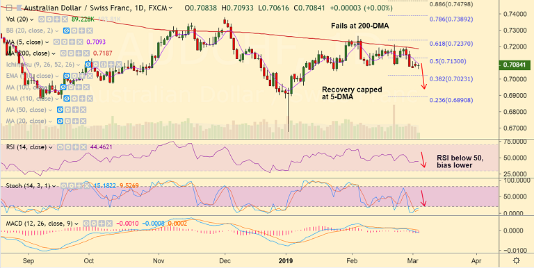 - AUD/CHF is trading largely unchanged at 0.7083 at 1045 GMT, bias bearish.