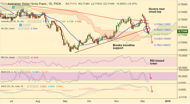 - AUD/CHF is trading 0.27% higher on the day at 0.7142, up from session lows at 0.7101.