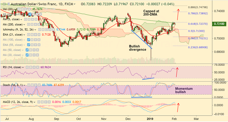 - On the weekly charts also, the pair finds major resistance at 55W EMA at 0.7244. Break above to see further gains.
