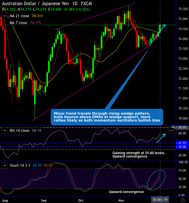 AUDJPY minor trend has been travelling through rising wedge pattern, where the interim bulls are currently extending the upswings after the test at the wedge support (refer daily plotting). Consequently, the current price spike above 21-DMAs as the pair shows vigorous rallies today about 0.72%, as a result, bullish engulfing pattern candle at 74.840 levels.