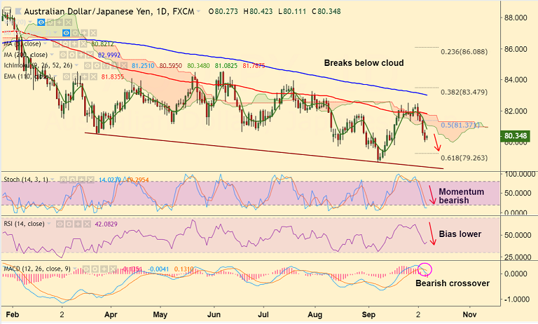 Recommendation: Good to stay short on upticks, SL: 80.80, TP: 80/ 79.70/ 79.45