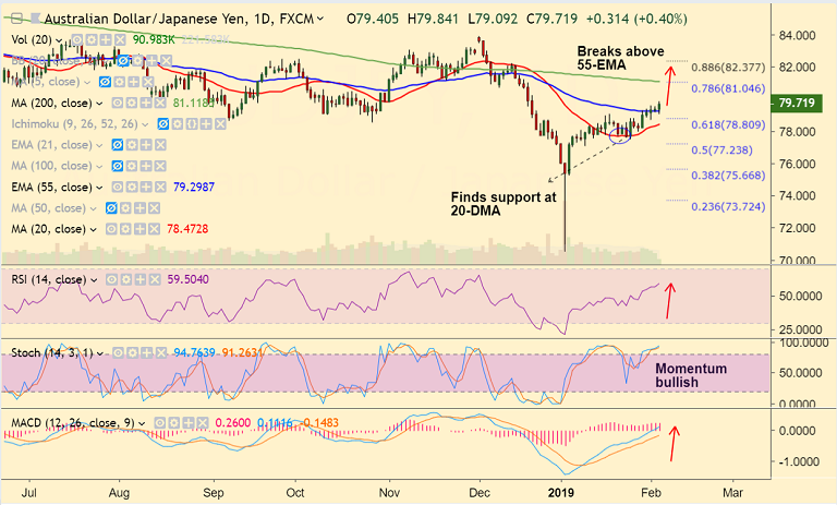 - AUD/JPY is trading 0.31% higher on the day at 79.64 at 0815 GMT, bias bullish.