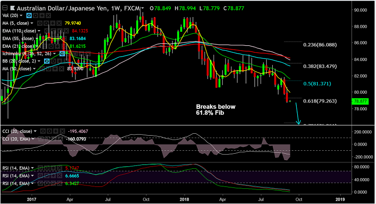 - AUD/JPY extending weakness after break below trendline support at 79.50, bias bearish.