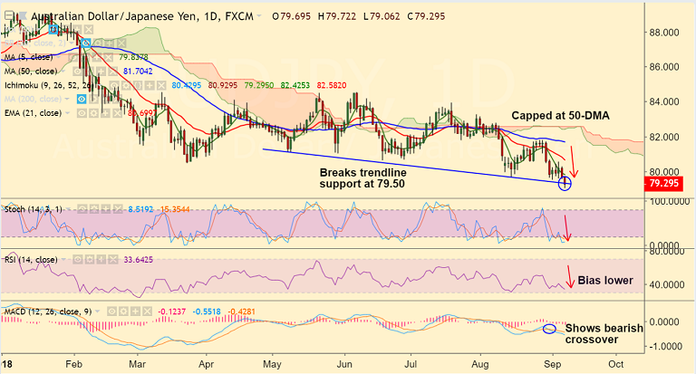 - AUD/JPY has broken below strong trendline support at 79.50, bias bearish.