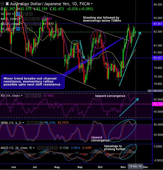 AUDJPY minor trend has been sliding through sloping channel so far, on the flip side, bulls in the short-term attempt to bounce back as it breaks-out channel resistance at 81.799 levels. For now, the current price remains well above DMAs, further rallies seem to be most likely as both RSI and stochastic indicates the buying momentum, while MACD has also shown bullish crossover remaining in bearish trajectory (refer daily chart).