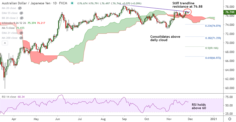 On the flipside, the pair finds major support at daily cloud at 76.21. Breach below cloud will negate any bullish bias. Retrace till 23.6% Fib at 74.07 then likely.