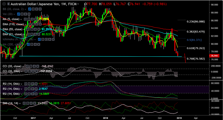Support levels - 76.78 (Nov 7 low), 75.96 (Sept 2016 low), 74.47 (88.6% Fib)