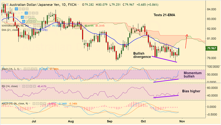 - AUD/JPY tests 21-EMA at 79.98, break above to see further upside.
