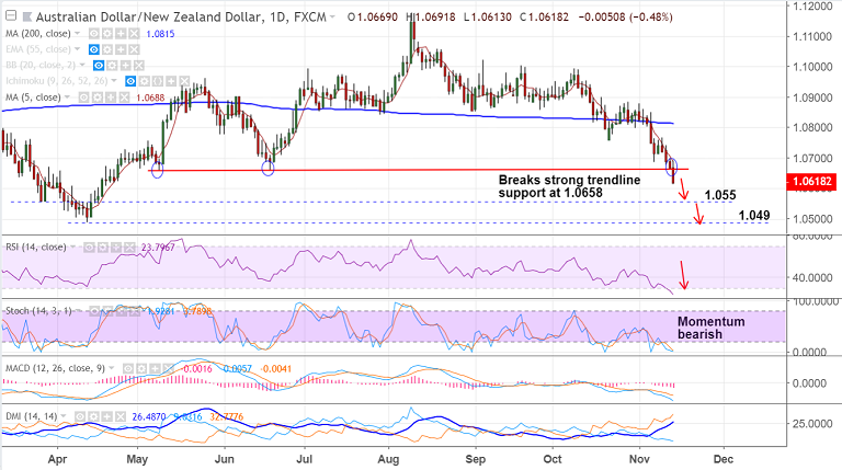 - AUD/NZD slumps lower on the day, is trading at 1.0617, down 0.48% at the time of writing.