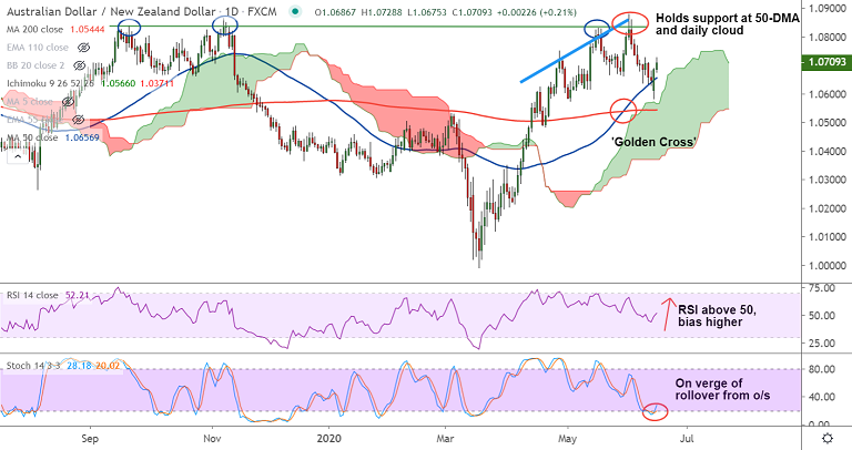 'Golden Cross' (bullish 50-DMA crossover on 200-DMA) to cushion downside in the pair. Resumption of upside will see test of 'Triple Top' at 1.0830.