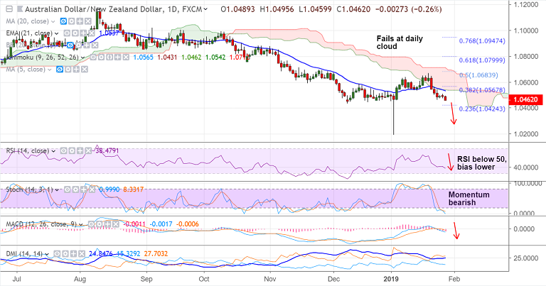 - On the flipside 21-EMA is strong resistance at 1.0537. Bearish invalidation only on break above daily cloud.