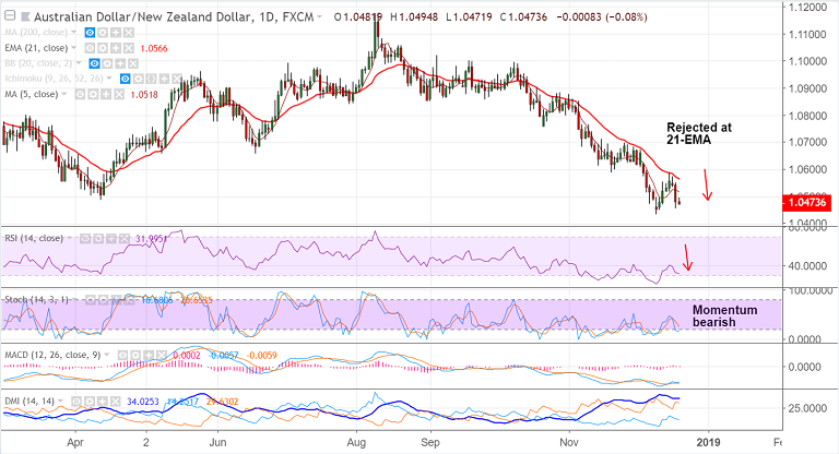 - The pair is in a long term downtrend and rejection at 21-EMA has opened up further downside for the pair.