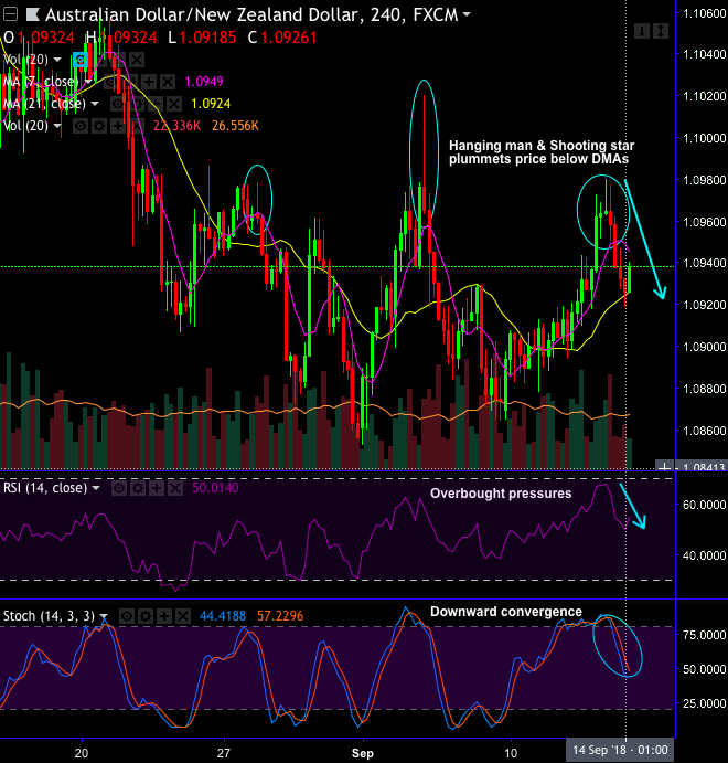 Whereas hanging man and shooting star occurred at 1.0963 and 1.0964 levels, these bearish patterns have nudged prices below SMAs (refer 4H chart).