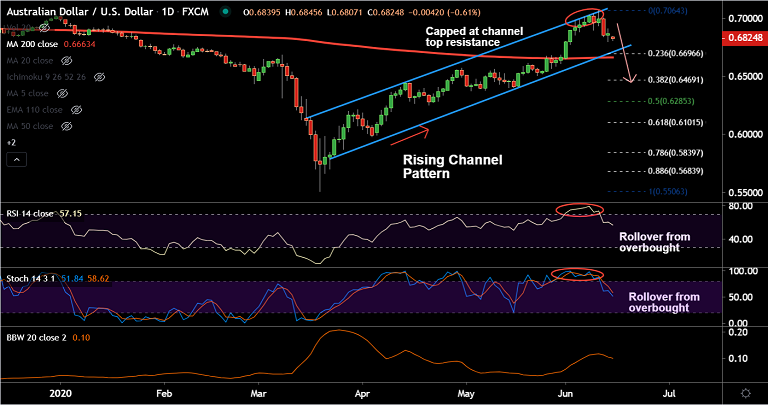 Summary: AUD/USD has been extending downside after rejection at channel top. Technical indicators have turned bearish and we see scope for dip till channel base at 0.6715. 200-DMA is major support at 0.6663, breach below will open downside. Focus on RBA meeting minutes (Tuesday 01:30 GMT) for direction.