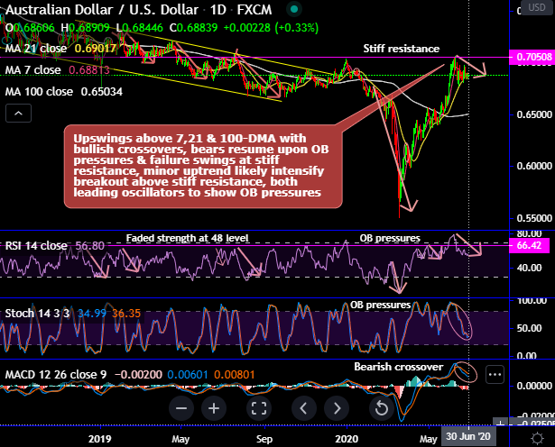 On a broader perspective, although interim bulls extended but restrained at the stiff resistance areas of 0.7070 levels & 21-EMAs, bears to drag price slumps on breakdown below double top neckline, major downtrend remains intact as both leading & lagging indicators (except stochastic) are indecisive but seem to be bearish bias.