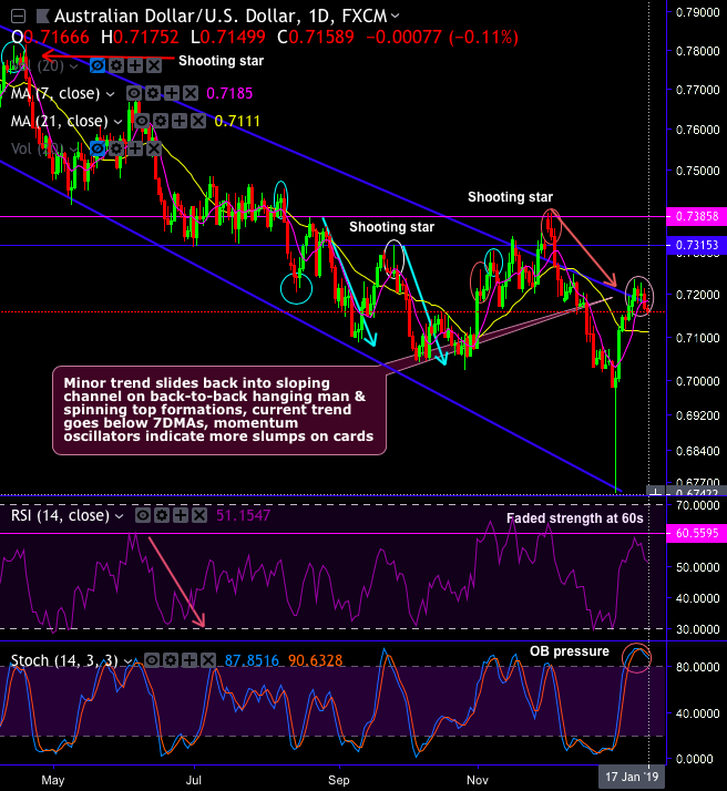 The hanging man followed by spinning top candles has occurred at 0.7196 and 0.7201 levels respectively.