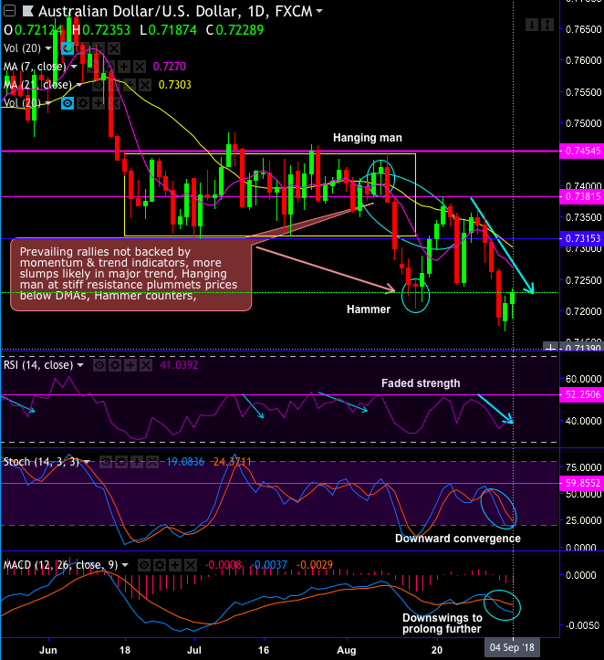 The pair earlier forms hanging man and hammer patterns at 0.7428 and 0.7238 levels respectively. The failure swings at the stiff resistance at 0.7381 and 0.7454 and steep slumps were observed in the recent past.