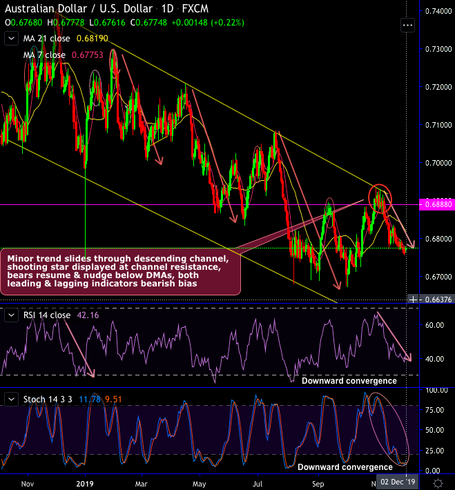 Technical chart and candlestick patterns: AUDUSD short-term trend has been sliding through descending channel (refer daily chart). Shooting stars patterns have popped up at 0.6893 levels (refer circular area) to signal weakness at the channel resistance. Consequently, the pair has shown the failure swings below DMAs. The bulls attempt to bounce back but restrained below 7DMA levels.
